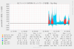 でも、運用最初はそれなりに正しそうなグラフなんだけど、数時間動かすと GPON の WiFi を使っているのに流量が表示されなくなる。munin の プラグイン の使い方として、Byte だと通信量のカウンタのオーバーフローしているのかと、色々触ってみるが、改善せず。やむなく パケット単位でのモニタリングに戻す。なんでかなぁ…