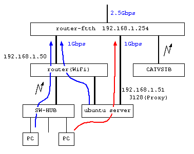 でも、さらなるトラヒックを活かすべく、内側ルータ内のサーバに2本目の LAN ポートを設け、内側 WiFi ルータを経由せずに上流ルータにつながるようにして、Squid の Proxy サーバのトラヒックだけこちらに流したい。