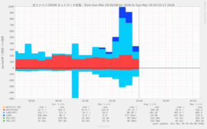 Proxy ナシの Chrome と Proxy アリの Firefox を起動して、YouTube を閲覧中。catvstb でも 上流ルータをそのまま使って YouTube を視聴中。CATVSTB=赤、SquidProxy=青、通常パケット=水色でトラヒックが分散されている。自宅外からWebサーバが閲覧できることも確認できた。満足…